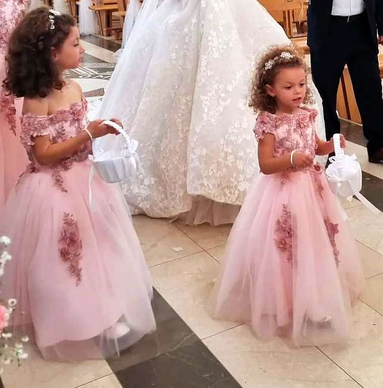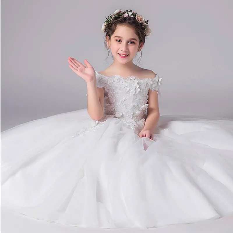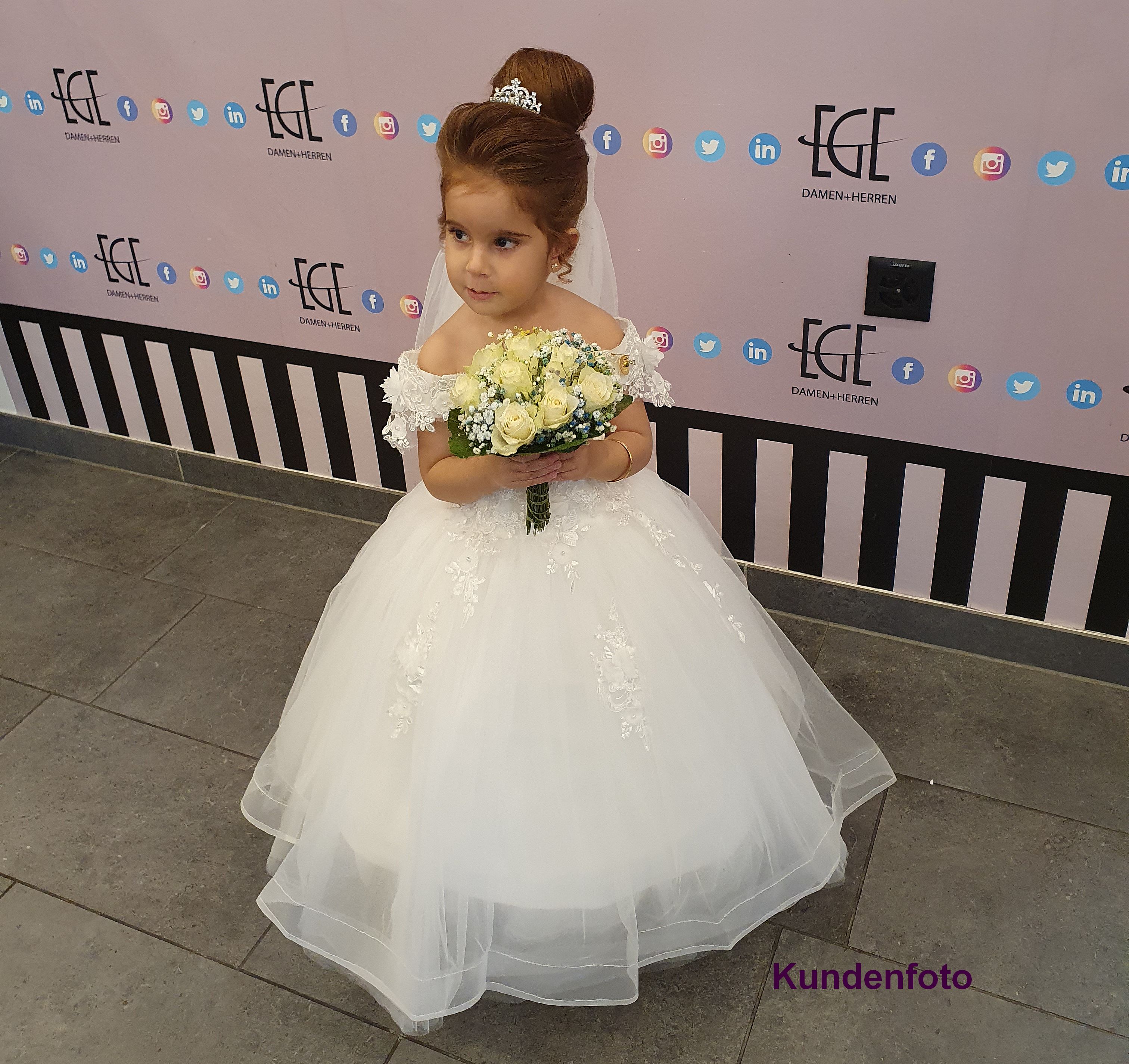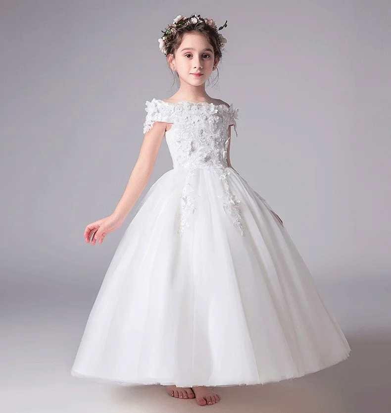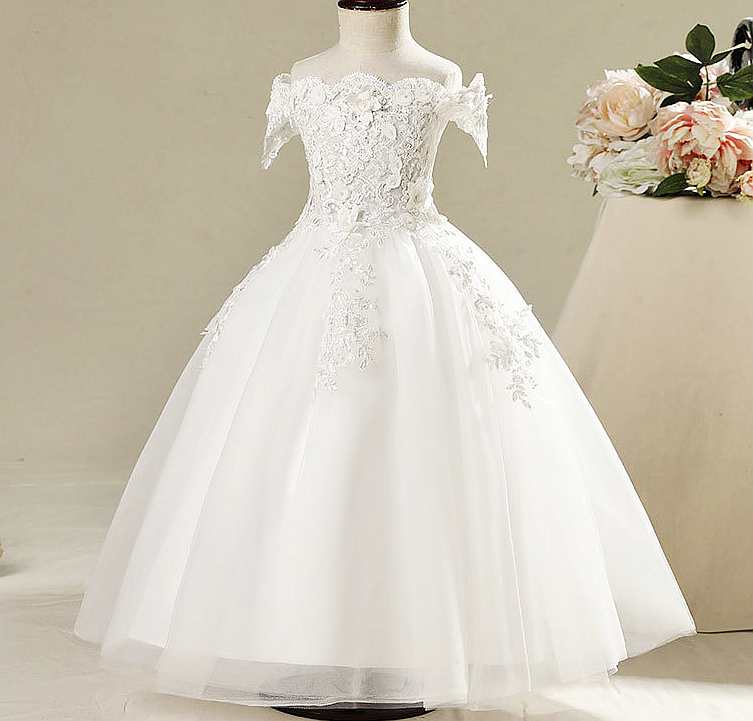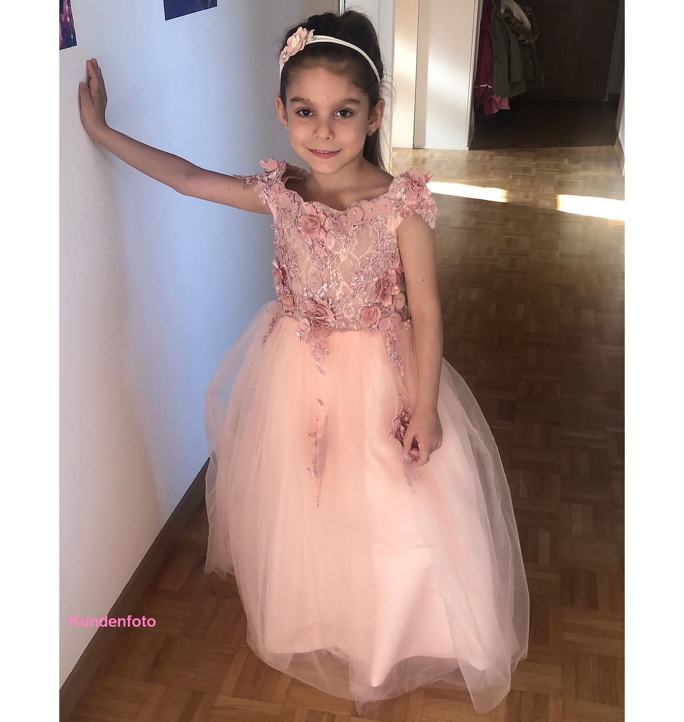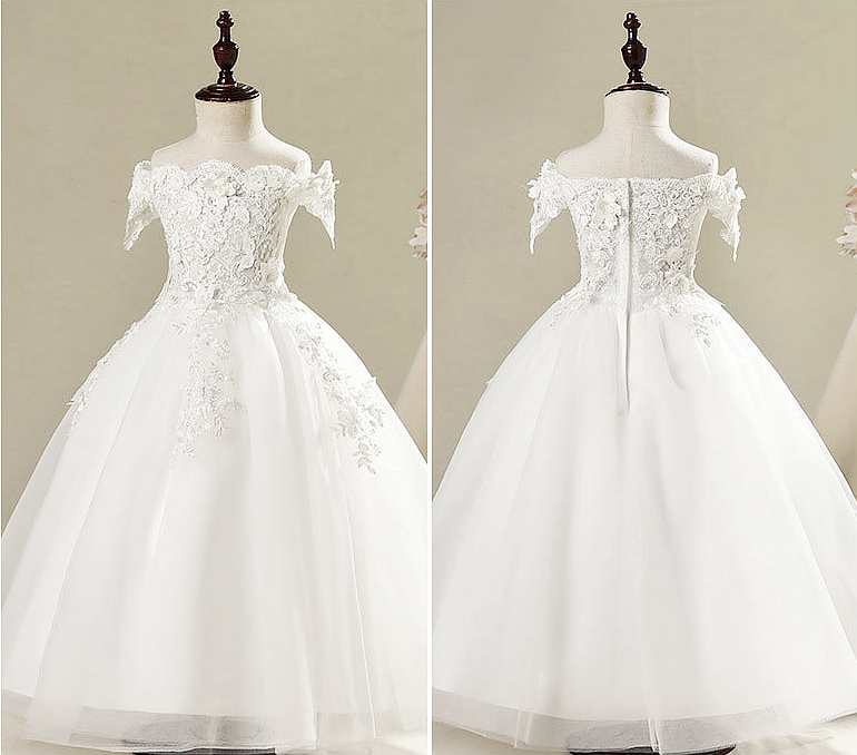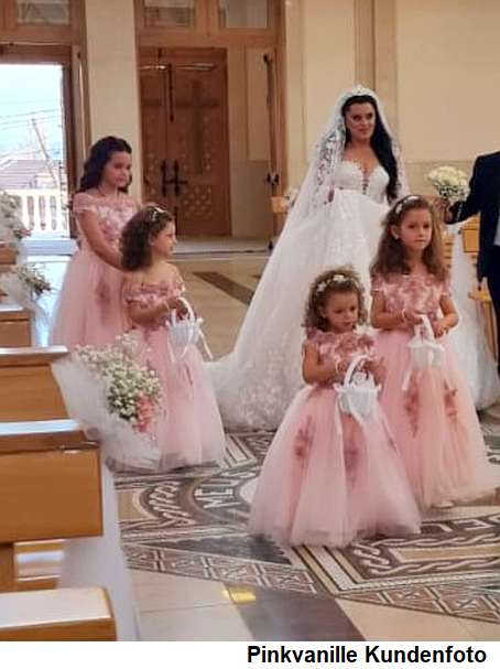 Dieses wunderschöne, schulterfreie Blumenmädchenkleid mit seinen zarten Blütenapplikationen passt perfekt zum festlichen Anlass!